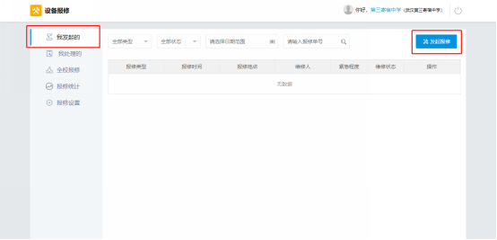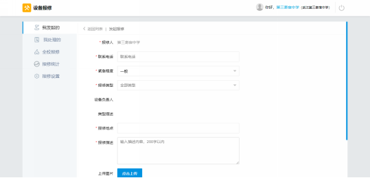 第3步:在设备报修页面,在“我发起的”的页面右侧点击“发起报修”,根据提示填写联系电话、紧急程度、报修类型,并填写详细的报修地点、报修描述、上传图片(若无图片可不用上传),提交报修后即完成线上报修。